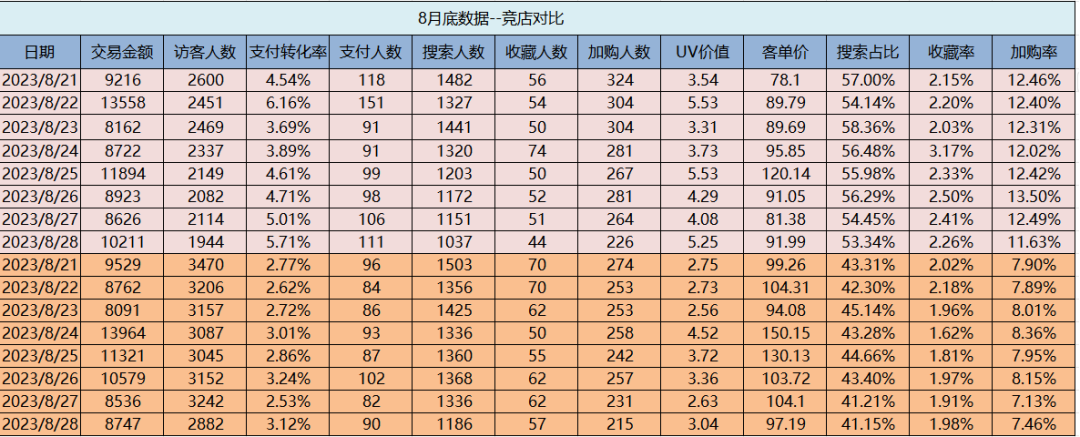 “了解競店的爆款產品,進行數據對比。因為各個店鋪結構的不同,我們會進行對應的改變,使用差異化競爭?!惫鉃嬖V我們,“每周競店數據進行對比,持續感知競店的實時動向,避免運營品牌店鋪被超越?!?/span>