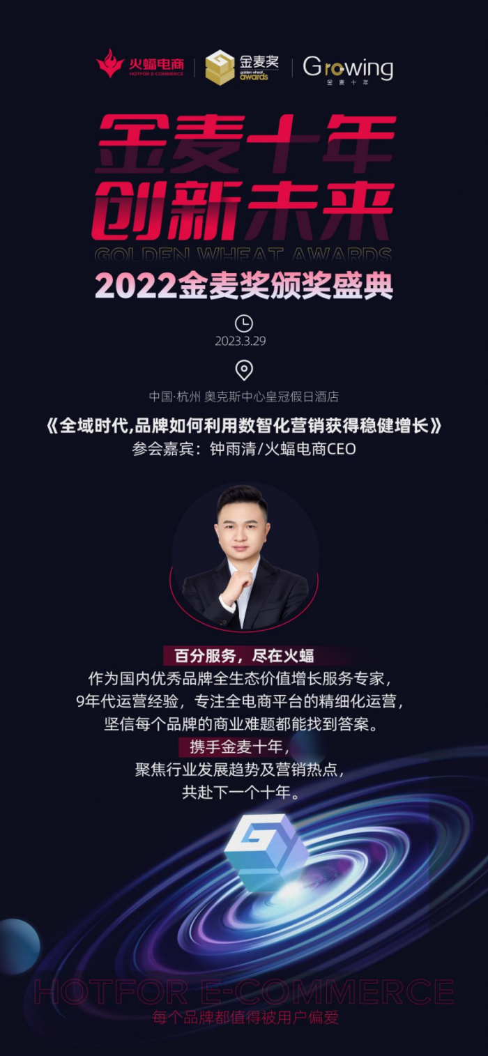 立于十年的時間節(jié)點,2022金麥獎頒獎盛典將以“金麥十年·創(chuàng)新未來”為主題,邀請火蝠電商在內的眾多平臺、品牌的行業(yè)大咖預測未來趨勢,分享營銷玩法干貨,共同探討電商營銷的新生態(tài)。