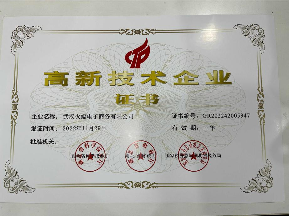 經企業申報、專家評審、審查認定等程序,武漢火蝠電子商務有限公司(以下簡稱“火蝠電商”)順利通過“高新技術企業”認證,榮獲由湖北省科學技術廳、湖北省財政廳、國家稅務總局湖北省稅務局聯合頒發的《高新技術企業證書》(證書編號:GR202242005347),此次獲得省級高新技術企業認證,是對該公司在核心自主知識產權、科技成果轉化能力、研究開發的組織管理水平、成長性指標和人才結構的綜合評估和認證,有效期限為3年。
