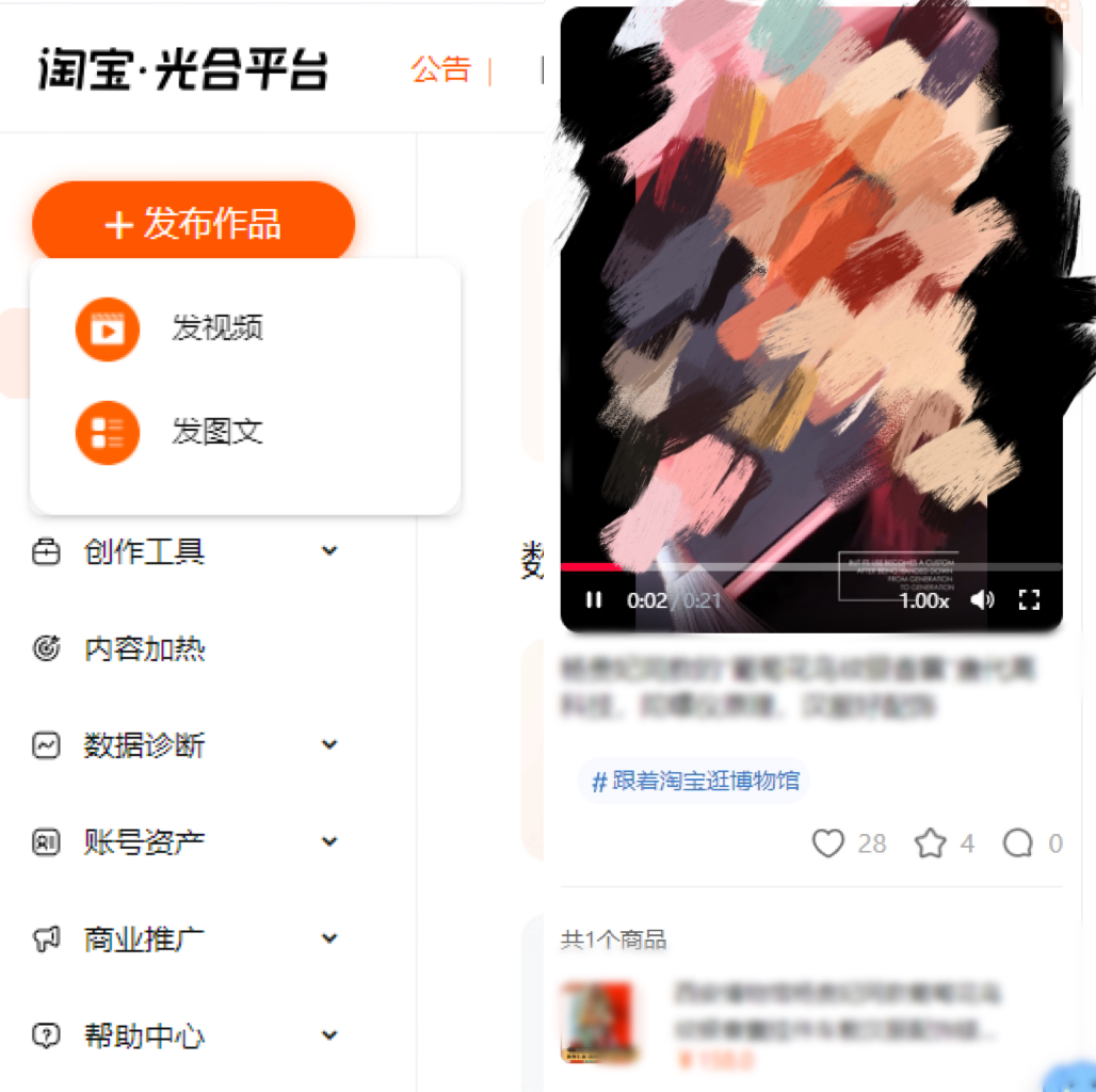 第三步發(fā)布光合平臺(tái):制作完成后的視頻來(lái)發(fā)布光合平臺(tái),選擇發(fā)視頻(視頻滿足條件:mp4、mkv、mov格式上傳,720p 以上,文件最大1.5G,時(shí)長(zhǎng)15分鐘以下)。編輯其產(chǎn)品相關(guān)的標(biāo)題和文案,添加當(dāng)時(shí)的熱點(diǎn)話題“跟著淘寶逛博物館”,同時(shí)添加對(duì)應(yīng)產(chǎn)品的跳轉(zhuǎn)。每周進(jìn)行發(fā)布4-5篇內(nèi)容,來(lái)持續(xù)曝光產(chǎn)品獲得對(duì)應(yīng)流量,開始店鋪幾乎沒有內(nèi)容流量,發(fā)布引導(dǎo)訪客數(shù)增加2w+。